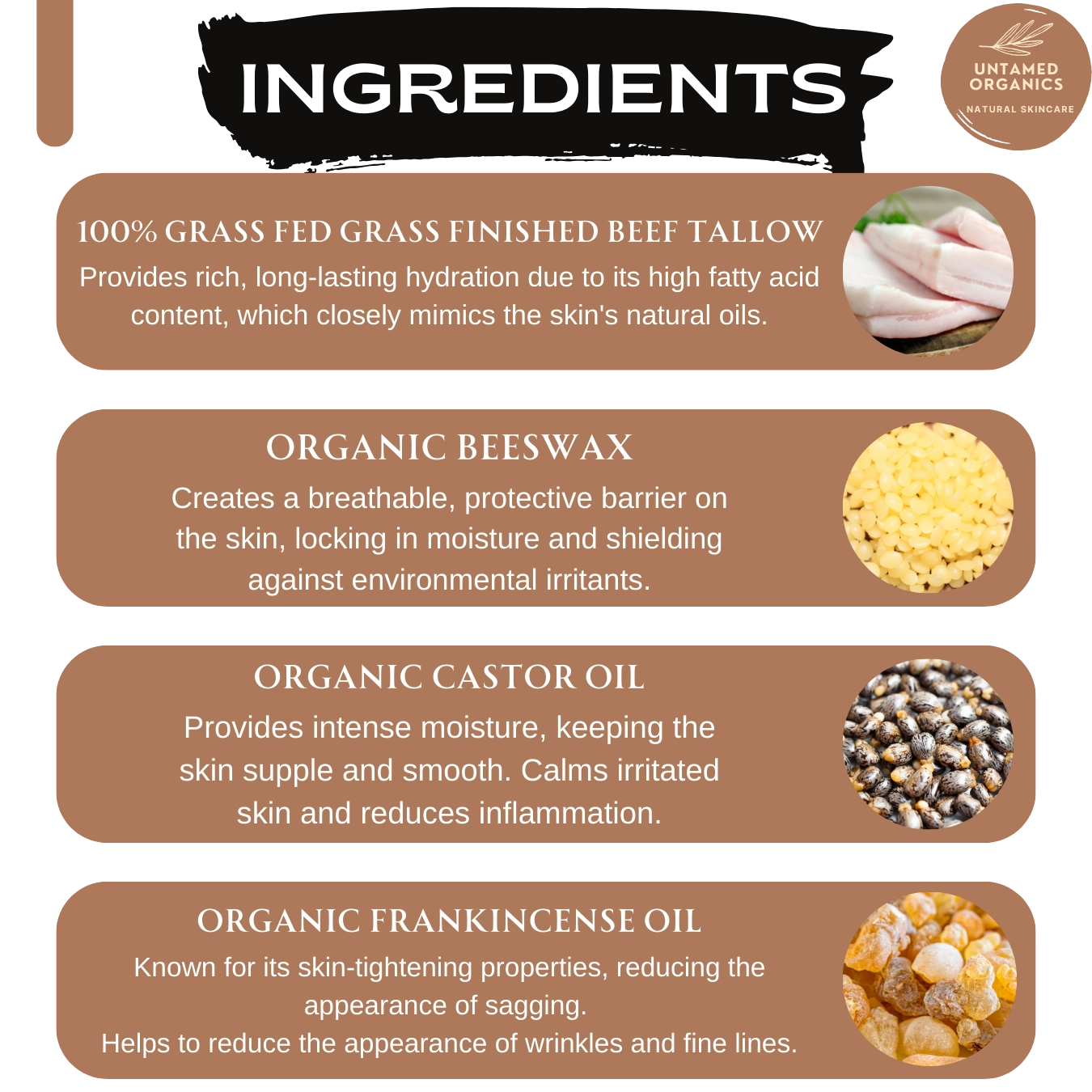 PURE & NATURAL: Handcrafted from 100% grass-fed beef tallow, organic castor oil, organic raw beeswax, and pure frankincense essential oil for a luxurious and effective skincare solution.
